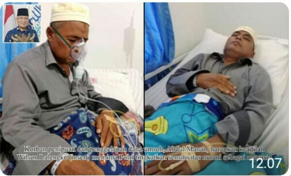 Sorot Jakarta – Korban tindak pidana penipuan dana umroh, Abdul Manan, S.Pd, dikabarkan masuk rumah sakit (lagi) di RS PMI Lhokseumawe, Aceh, karena muntah darah terus-terusan dan komplikasi penyakit yang dideritanya sejak beberapa tahun lalu. Hal itu disampaikan Ketua Umum Persatuan Pewarta Warga Indonesia (Ketum PPWI), Wilson Lalengke, kepada media ini, Rabu, 29 November 2023.