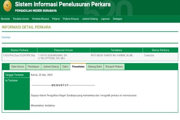 Ironisnya tiba tiba di SIPP PN surabaya pada hari kamis 3 oktober 2024 adanya jadwal sidang agenda putusan atau vonis terhadap terdakwa Putu, seharusnya kalau memang benar ada sidang tuntutan akan nampak di SIPP dijadwal sidang uaraian berapa ancaman yang di kenakan terhadap terdakwa,di SIPP disamarkan tuntutannya “BLENG alias ZONG “.
